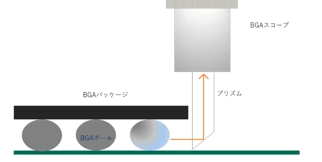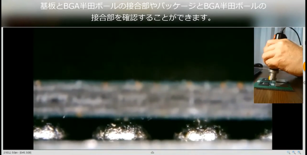 BGAパッケージの観察は、スコープをパッケージと基板の隙間に挿入する際の角度と慎重さが重要です。