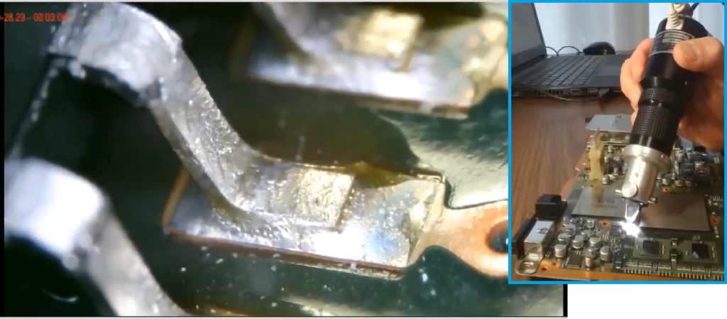 (この画像では、BGAスコープをパッケージ下に挿入し、半田ボールの接合部を詳細に観察している様子がわかります。)