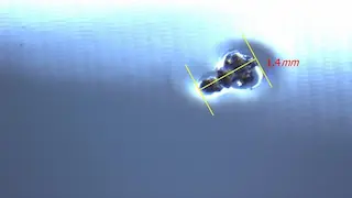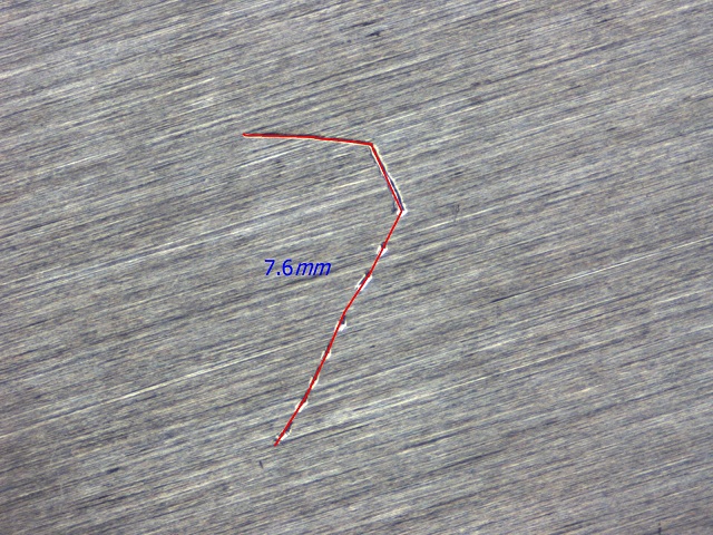 生産工程におけるトラブルのひとつに打痕あるいはシミ・ムラがあります。 製品や部品に付いた打痕は付着場所や原因を解析するうえでも、大きさの計測が非常に重要になってきます。打痕は楕円であったり多角形に近い形状であったりします。 多角形面積計測は、打痕の周囲をなぞっていくことで、およその周囲長、面積を簡単に計測することができます。 その他の応用として、治工具の破損部位の計測です。治工具の破損は、生産に大きなダメージを与えてしまうため、破損部位のおおよその面積や大きさを計測することは原因解析に重要なことです。 また、形状が非常に複雑な観察体の面積計測にも有効です。