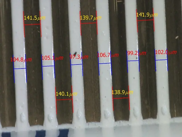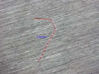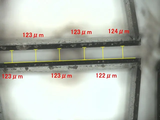 この計測の特長は1本の任意の直線から任意の点までの垂直距離を複数計測できることです。 観察体の断面で利用すれば、厚みのバラツキ確認に利用できます。 加工品においては規定の位置から加工部位までの仕上がり寸法確認に有効です。 また、位置決めした後の隙間や線幅、加工幅の確認にも応用できます。